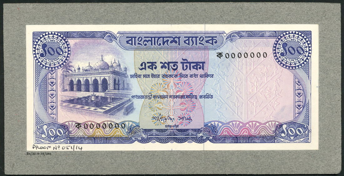 (†) Bangladesh Bank, a printers archival composite obverse and reverse essay on card for a proposed issue of 100 taka, ND (1975), zero serial numbers, violet-blue and multicoloured, the Tara Masjid (the Star Mosque) in Dhaka at left, ornate engine turnings in field, reverse blue, bullock carts with harvest, river and boat top right