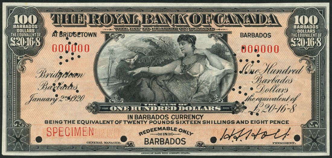 (x) Royal Bank of Canada, Barbados, specimen $100, 2 January 1920, red serial number 000000, black on salmon underprint, allegorical maiden at centre, value top left and right and at low centre with sterling equivalent, reverse, orange, bank arms at centre, hole punched and perforated PAID right and left