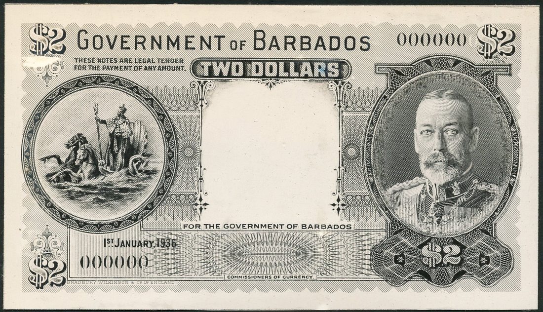 Government of Barbados, obverse and reverse printers archival photographs for $2, 1 January 1936, black and white, George V at right, King in Biga drawn by Hippocamps at left, value at each corner