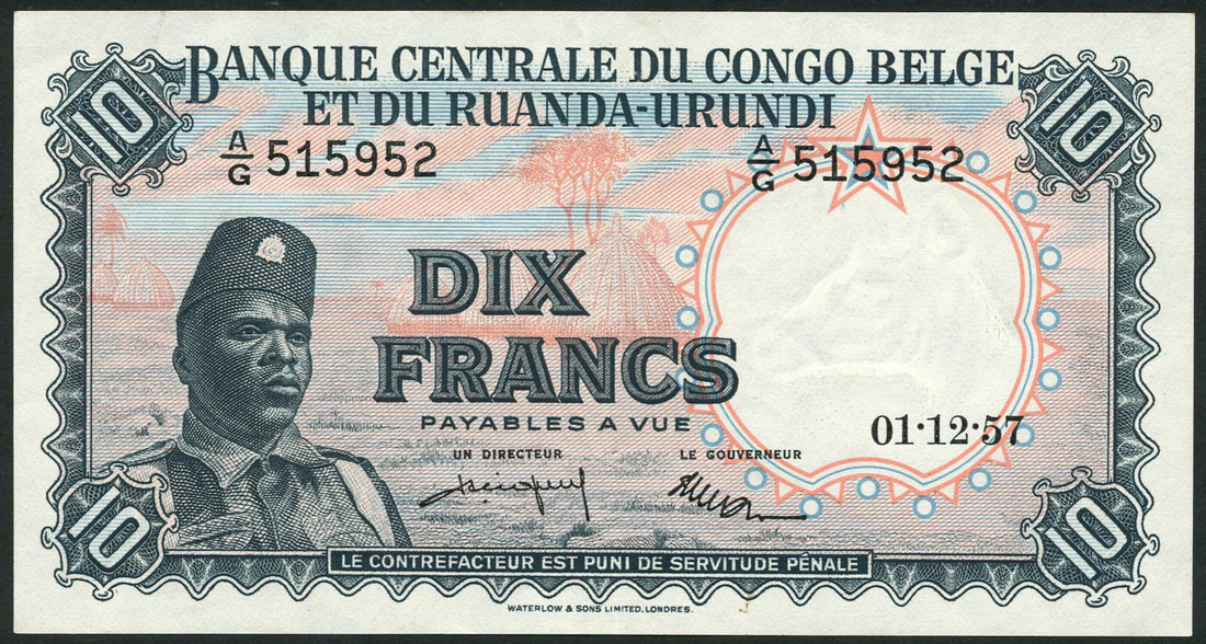 (†) Banque Centrale du Congo Belge et du Ruanda-Urundi, 10 francs (2), 1 December 1957, serial number A/G 515952, A/M 177625 black, pale blue and pink, soldier at left