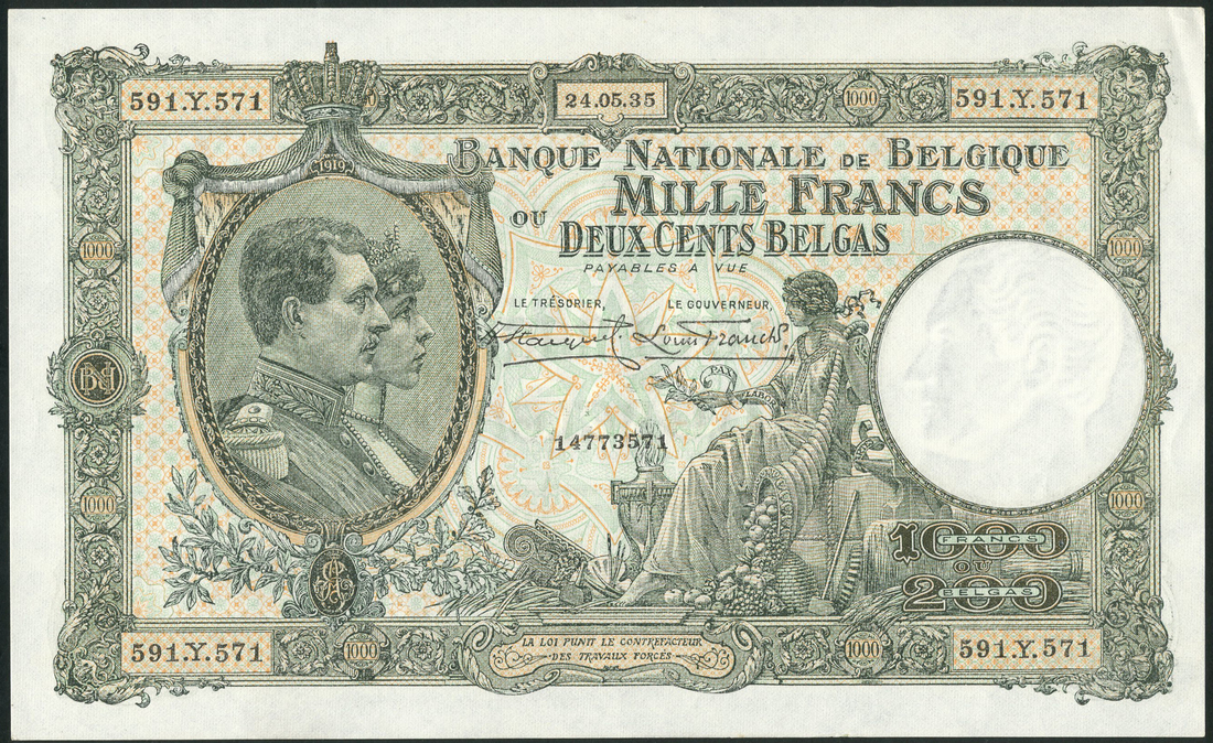 National Bank of Belgium, 1000 francs- 200 belgas, 1935 (3), 1938 (5), green on multicolour underprint, portrait of King Albert and Queen Elisabeth at left