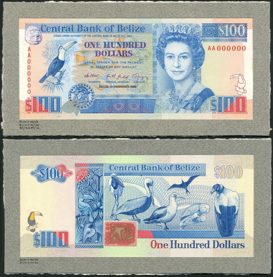 (†) Central Bank of Belize, a printers archival composite essay on card for a proposed issue of $100, 1 December 1989, serial number AA 000000, blue and multicoloured, Elizabeth II at right, Queen Triggerfish and Queen Angelfish at centre, toucan at left, arms low left, Slusher, Arnold and Alvarez signatures, reverse blue and multicoloured, local birds and Baird's tapir in field