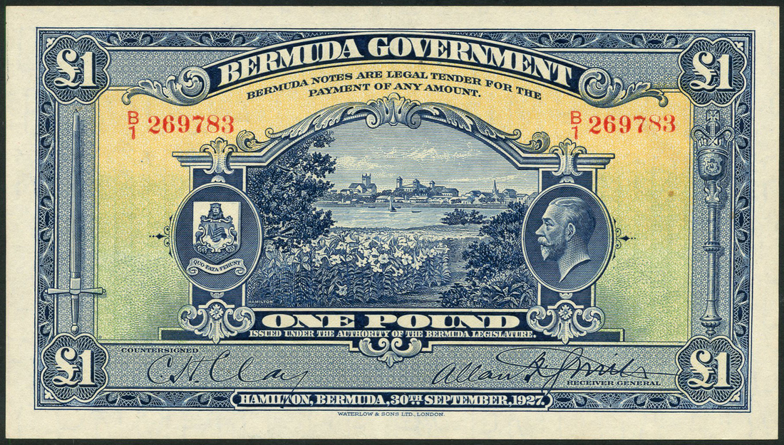 (x) Bermuda Government, £1, 30 September 1927, red serial number B/1 269783, blue and pale green and yellow, a view of Hamilton harbour from Crow's Lane at centre, head of George V at right, the Crest of Bermuda at left, value at each corner, printed signature of C.H.Clay at low left, of the Receiver General Allan F.Smith low right, reverse blue and white, arms at centre, value at left and right