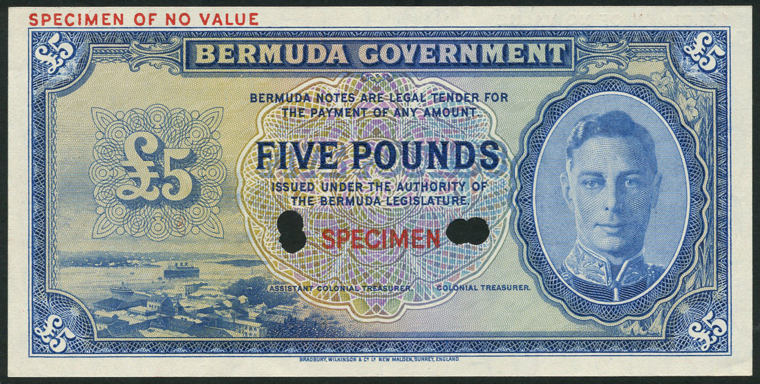 (†) Bermuda Government, colour trial £5, ND (ca.1941), no serial numbers, blue and multicoloured, head of George VI in oval frame at right, value at left, at low left a vignette depicting the cruise ship 'Monarch' in Hamilton harbour, reverse blue and lilac, arms at centre, value at left and right