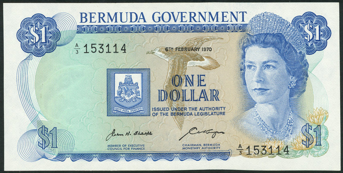(x) Bermuda Government, specimen $1, 6 February 1970, serial number A/1 000000, also $1 (2), 6 February 1970, prefix A/3, blue and green, Elizabeth II at right, Bermuda Petrel (cahow) at centre, printed signatures of Sharpe and Kempe, reverse blue, Bermuda fitted dinghy's
