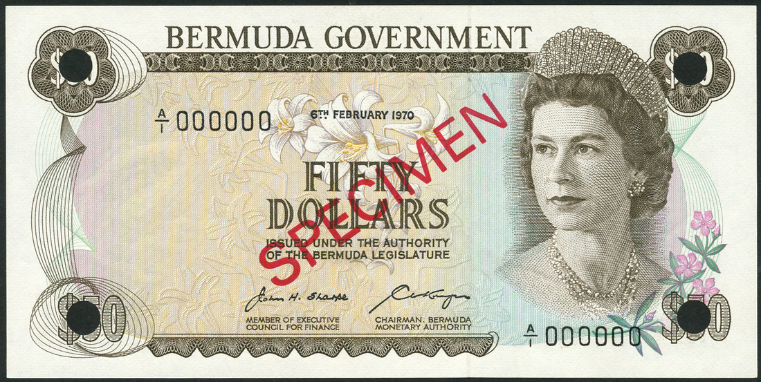 (x) Bermuda Government, specimen $50 , 6 February 1970, serial number A/1 000000, brown and blue-green, Elizabeth II at right, oleander flowers, printed signatures of Sharpe and Kempe, reverse brown, Gibb's Hill lighthouse in Southampton Parish