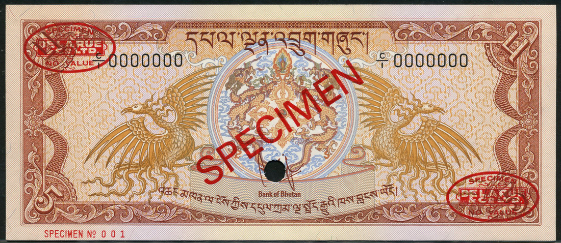 (†) Royal Government of Bhutan, specimen 2 ngultrum, 1981, serial number B/1 000000, specimen 5 ngultrum, 1981, serial number C/1 000000, grey and brown respectively, Royal emblem at centre, stylised dragons or birds at left and right