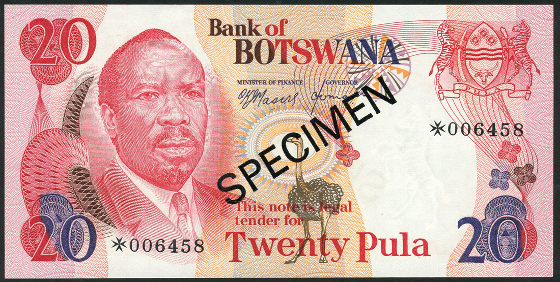 Bank of Botswana, specimen 1, 2, 5, 10, 20 pula, ND (1979), matching serial numbers *006458, brown, blue, purple, green and red respectively, portrait Sir Serese Khama at left, also, Bank of Ghana, 1, 2, 5, 10 cedis, matching serial numbers *0000143, all multicolour