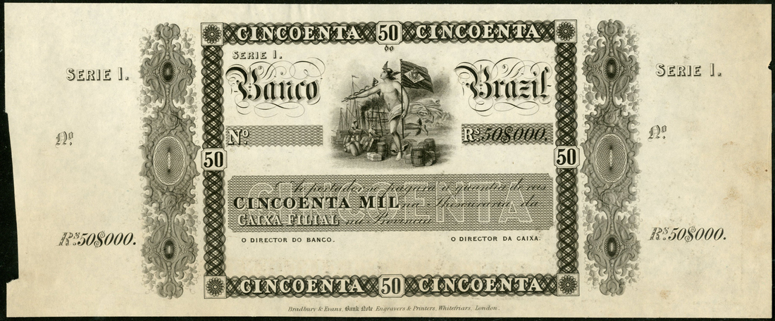 (†) Banco do Brazil, specimen 50000 reis, ND (1856), uniface, black and grey on cream paper, allegorical figure holding Brazilian flag, harbour scene in background, intricate border and panels at left and right