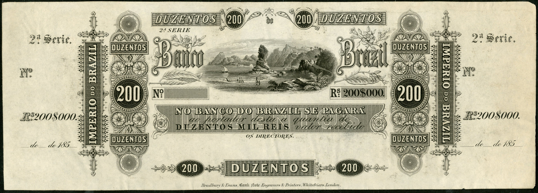 (†) Banco do Brazil, specimen 200 mil reis, ND (1857), black and grey on cream paper, people on shoreline with boat and mountains in background, value in ornate panels at left and right