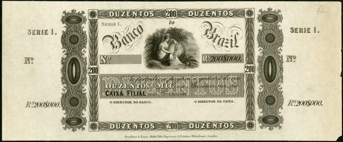 (†) Banco do Brazil, specimen 200 mil reis, ND (1856), no place name, black and grey on cream paper, seated woman with globe at centre looking out at ships at sea, elaborate borders and panels at left and right