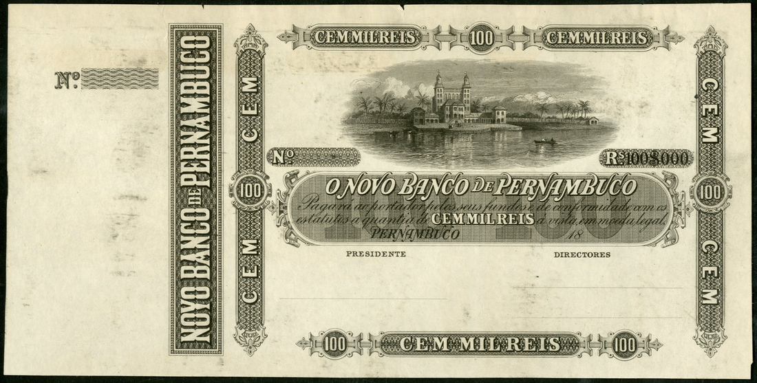 (†) O Novo Banco de Pernambuco, Brazil, specimen/proof 100 mil reis, 18- (1858), no serial number, uniface, black on thin white paper, lovely vignette of a lakeside villa at top centre, value at centre and in borders