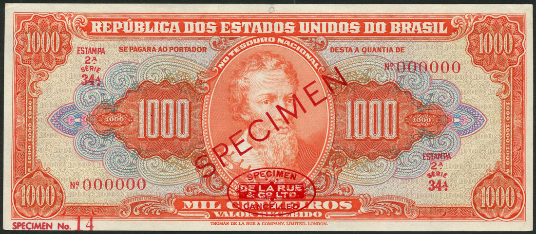 (†) Republica dos Estados Unidos do Brasil, a group of specimens of the Estampa 2A Series, ND (1949-62), all zero serial numbers, comprising 200 Cruzeiros, series 30, no signature, olive-green, Dom Pedro I at centre; 500 Cruzeiros, series 721, olive-grey, Joao VI at centre; and 1000 Cruzeiros, series 34, no signature, orange, Alvares Cabral at centre, all overprinted SPECIMEN in red with one or two De La Rue specimen ovals on obverse and reverse, two punch holes in 500 Cruzeiros only