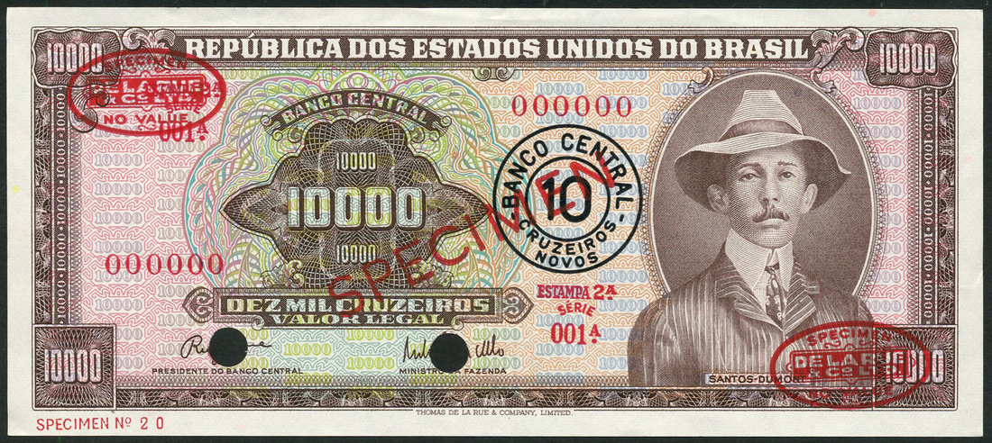(†) Republica dos Estados Unidos do Brasil, specimen 5000 Escudos, ND (1963-64), Estampa 2A, series 400, serial number 000000, red, Tiradentes at right; specimen 10 Cruzeiros Novos on 10000 Cruzeiros, ND (1966-67), Estampa 2A, series 001, serial number 000000, brown Dumont at right, both overprinted SPECIMEN in red with two De La Rue specimen ovals on obverse and reverse, two punch holes