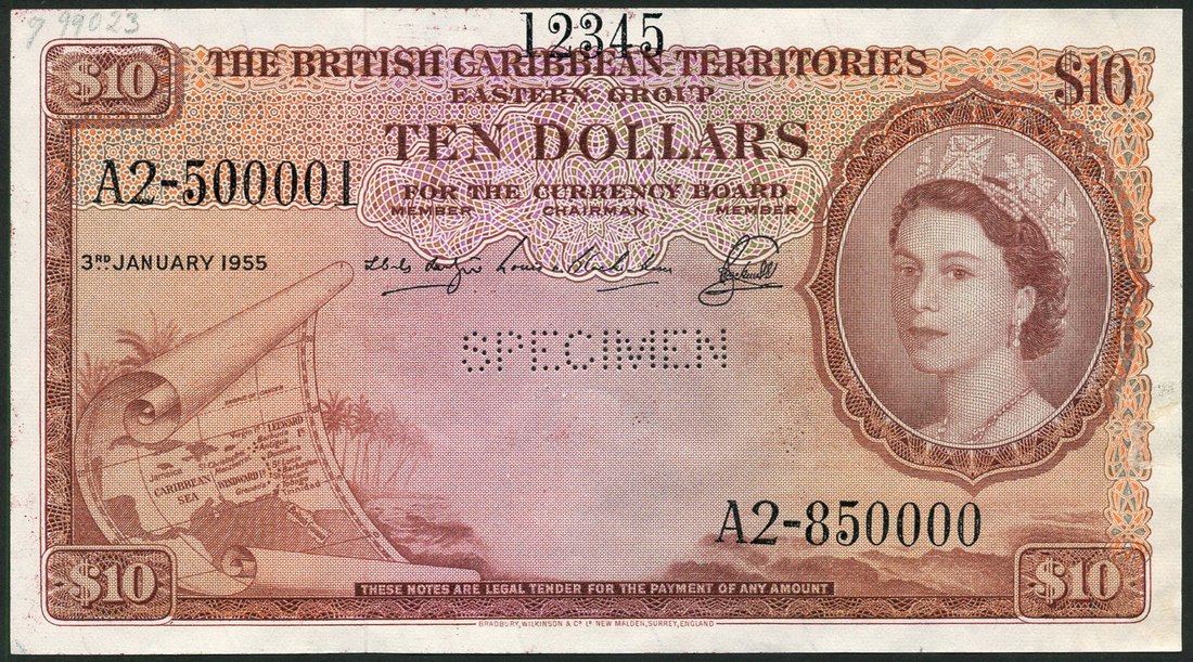 (†) British Caribbean Territories, printers archival specimen $1, 2 January 1957, serial number U2-100001-Y2-100000, red and lilac, printers archival specimen $5, 2 January 1957, serial number F2-200001 - J2-700000, green on multicolour underprint, also printers archival specimen for a $10, 3 January 1955, serial number A2-500001-A2-850000, brown and multicoloured, all Elizabeth II at top right, map at low left, value at top centre and each corner, reverse green, arms and values, perforated SPECIMEN, ink annotations in top margins