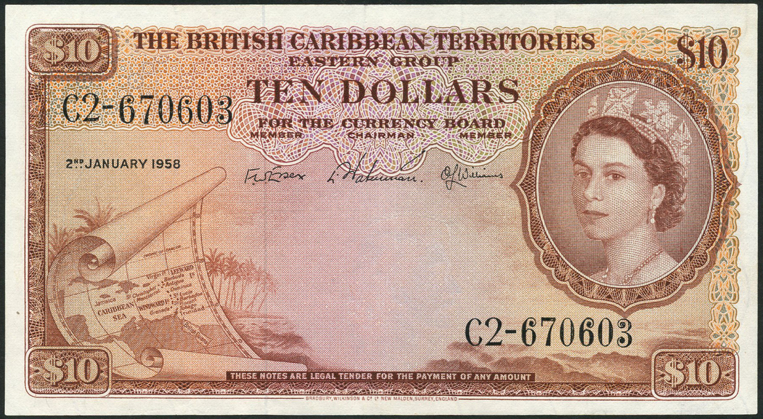 British Caribbean Territories, $10, 2 January 1958, serial number C2-670603, brown on multicolour underprint, Elizabeth II at right, map of the Caribbean at low left