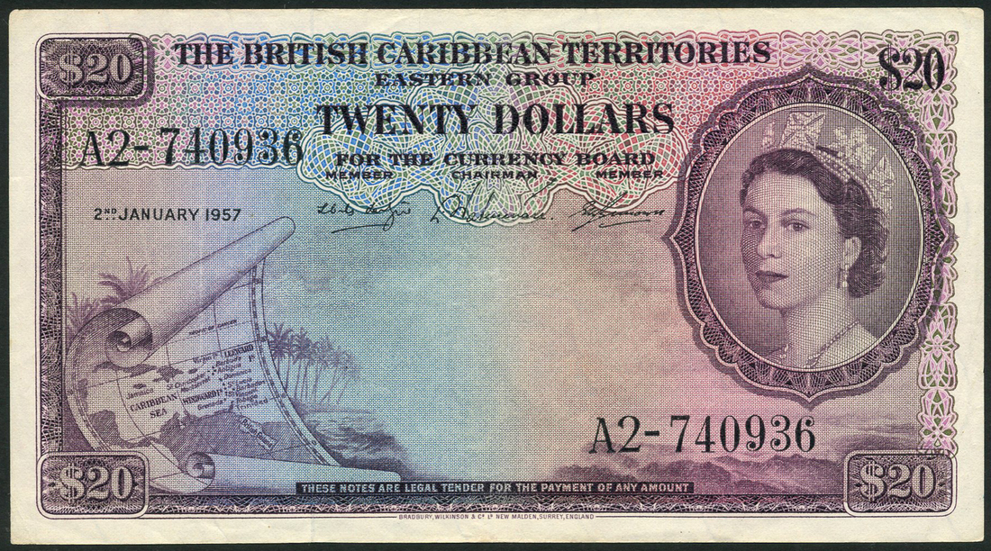 British Caribbean Territories, $20, 2 January 1957, serial number A2-740936, purple on multicolour underprint, Elizabeth II at right, map of the Caribbean at low left