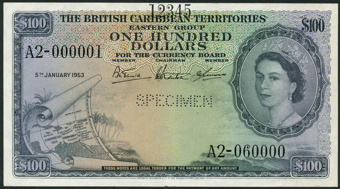 (†) British Caribbean Territories, specimen $100, 5 January 1953, serial number A2 000001-A2 060000, grey, pale green and orange, Elizabeth II at right, map of the Territories at low left, value top centre and at each corner, signatures of McDavid, Robertson and Burrowes, reverse grey, arms and value