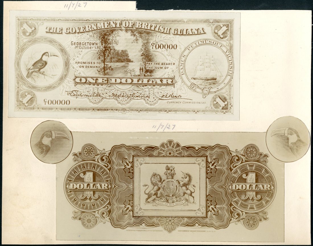 Government of British Guiana, obverse and reverse printers archival photographs showing designs for a $1, 1 October 1927, black and white, Toucan at left, sailing ship at right, lake scene at centre, value at each corner, reverse arms at centre, value at left and right
