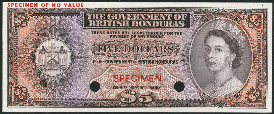 (†) Government of the British Honduras, a group of specimen colour trials of the ND (1953-73) issue comprising $1, blue, green and yellow; $2, brown, purple and orange; $5, violet, brown and orange-pink, all Queen Elizabeth II at right, arms at left, reverse ornate guilloches, all overprinted SPECIMEN in red on obverse and reverse, two punch holes