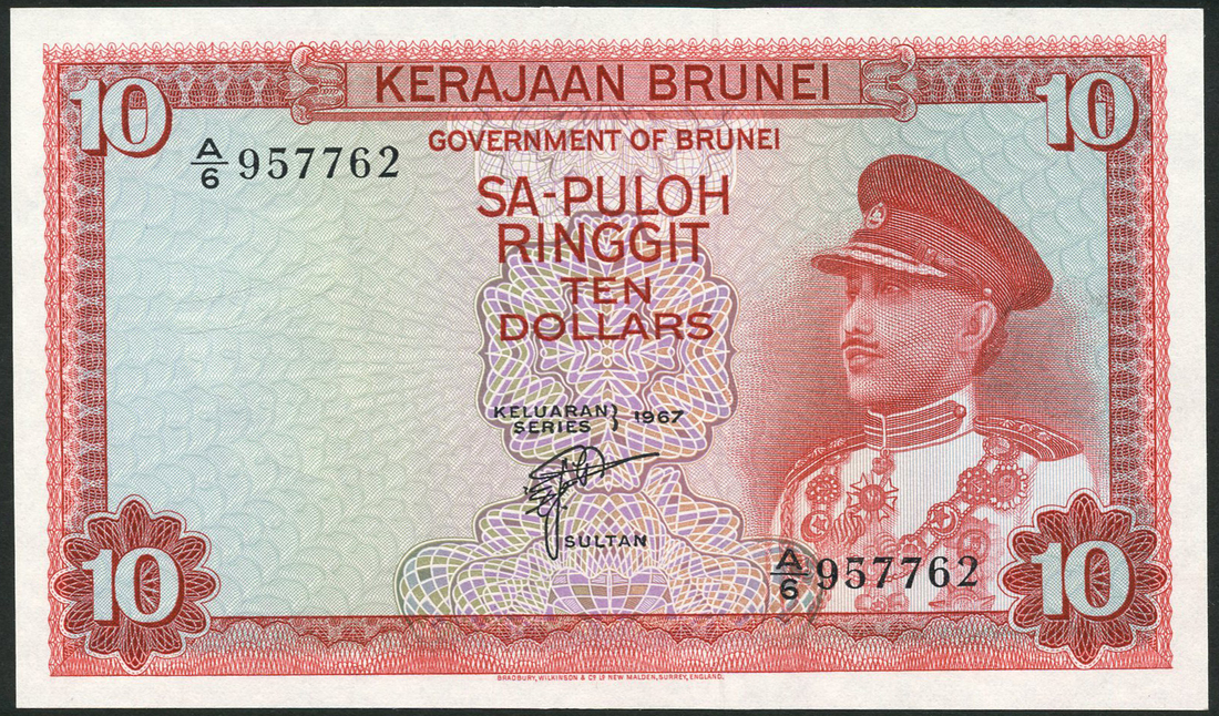 (x) Government of Brunei, $10, ND (1967), prefix A/6, red and pale blue, Sultan Ali Omar Saifuddin III at right
