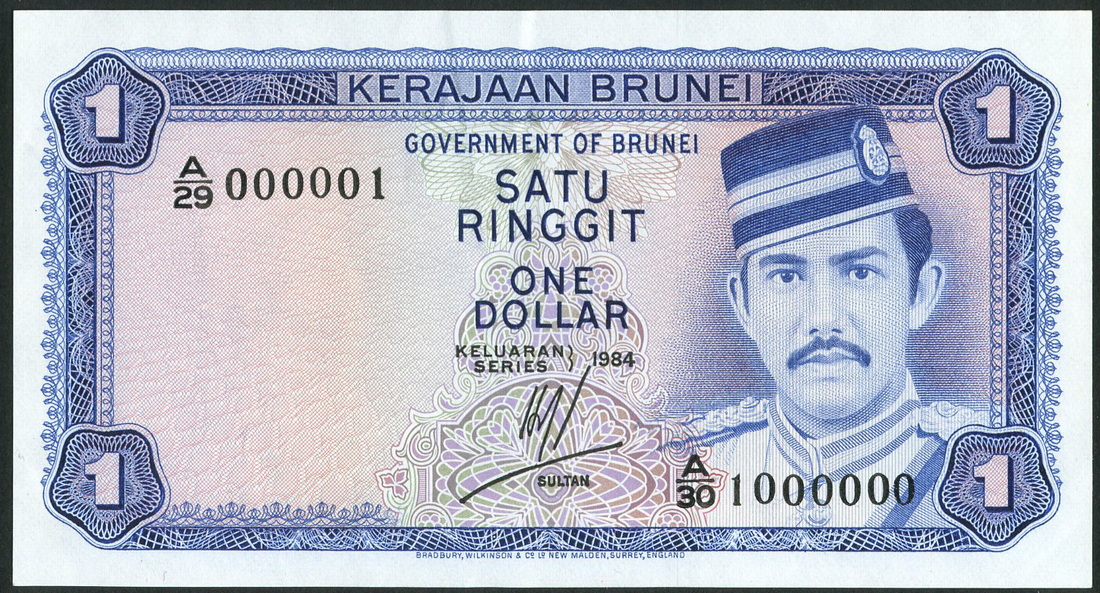 (†) Government of Brunei, a group of specimens and proofs for 1 ringgit, 1984, comprising printers archival specimen, serial numbers A/29 000001-A/30 1000000, bank specimen (2), zero serial numbers, a complete proof with no signatures or serial numbers, and stage proofs (5) for the obverse and reverse, each showing the various layers of printing, blue on multicoloured underprint, Sultan Waddaulah at right