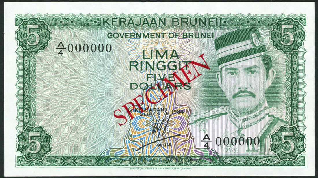 (†) Government of Brunei, a group of specimens and proofs for 5 ringgit, 1984, comprising printers archival specimen, serial numbers A/4 700001-A/5 500000, bank specimen (2), zero serial numbers, a complete proof with no signatures or serial numbers, and stage proofs (6) for the obverse and reverse, each showing the various layers of printing, green on multicoloured underprint, Sultan Waddaulah at right