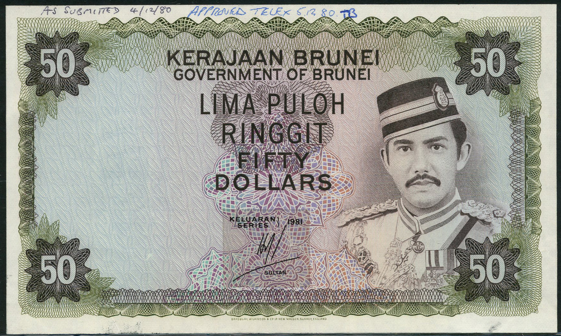 (†) Government of Brunei, specimen/proof 50 ringgit, 1981, no serial number, brown and olive green on multicolour underprint, Sultan Waddaulah at right, value at each corner, reverse olive green, mosque at centre-left, signature printed on transparency and glued in place