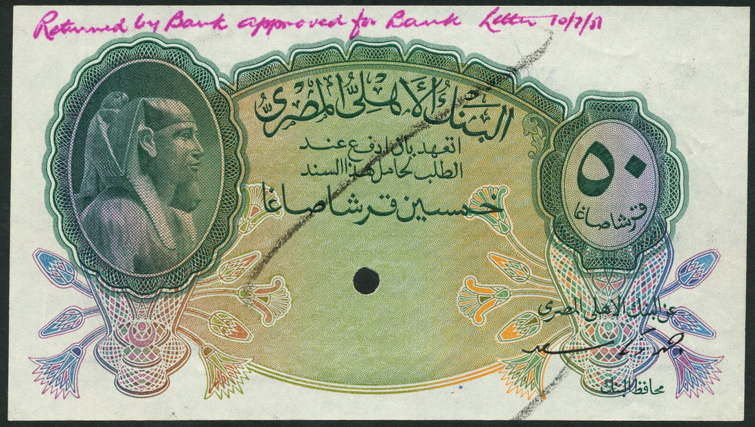 (†) National Bank of Egypt, 50 piastres, ND (1935), no serial number, green on multicolour, Tutankhamen at left, value at right, reverse blue, crescent and stars at left
