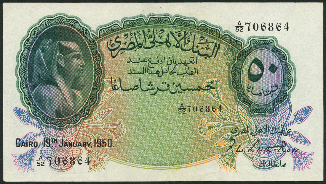 (x) National Bank of Egypt, a consecutive pair of 50 piastres, 19 January 1950, serial number A/52 706863/4 green on multicolour underprint, Tutankhamen at left, value at right, reverse blue