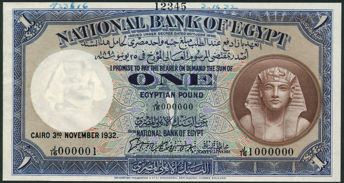 (†) National Bank of Egypt, printer's archival specimen 1 Pound, 3 November 1932, serial number run J/16 000001 to J/16 1000000, Cook signature, blue, brown and multicoloured, Tutankhamen at right, value in each corner, reverse green, Mosque of al-Mansour Seif el-Dine Qalawun at centre, value in guilloche at left, perforated CANCELLED