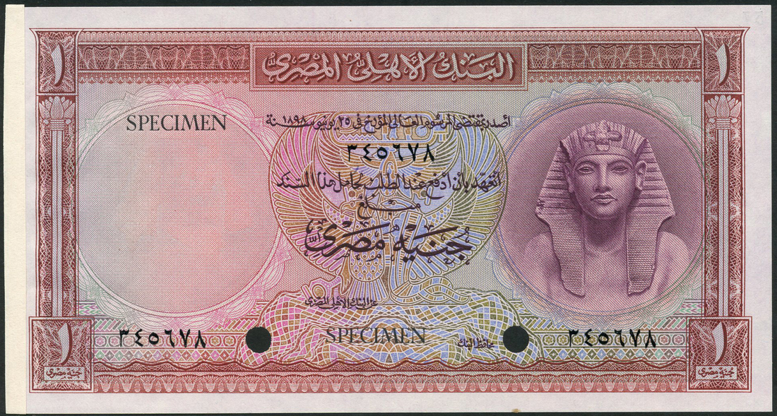(†) National Bank of Egypt, £1, ND (1952), serial number 345678, brown and purple on multicolour, Tutankhamen at right, watermark at left, reverse brown, ruins at centre, black SPECIMEN overprint, cancel hole