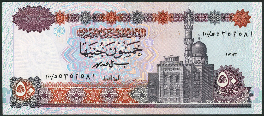 (x) Central Bank of Egypt, £50, 1993, prefix multicolour, Amir Qijmas al Ishaqi mosque at right,