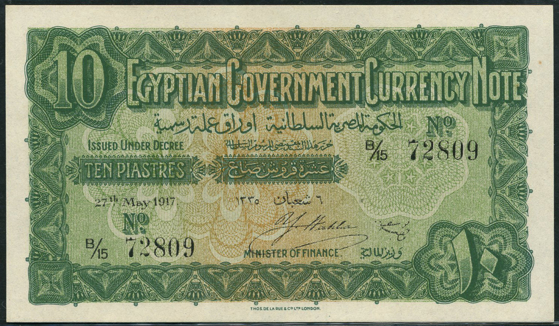 Egyptian Government Currency notes, 10 piastres (2), 27 May 1917, serial numbers B/15 72809 and B/15 72810, green on tan and light green underprint, value at top left and low right, reverse blue, Colossi of Memnon at centre, Yousef Wahba signature