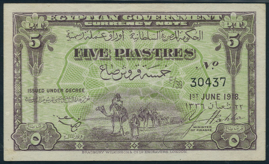 (x) Egyptian Government Currency notes, 5 piastres, 1 June 1918, serial number F/39 30437, violet and pale orange and green, Wahba signature, reverse blue, sphinx at low left and right