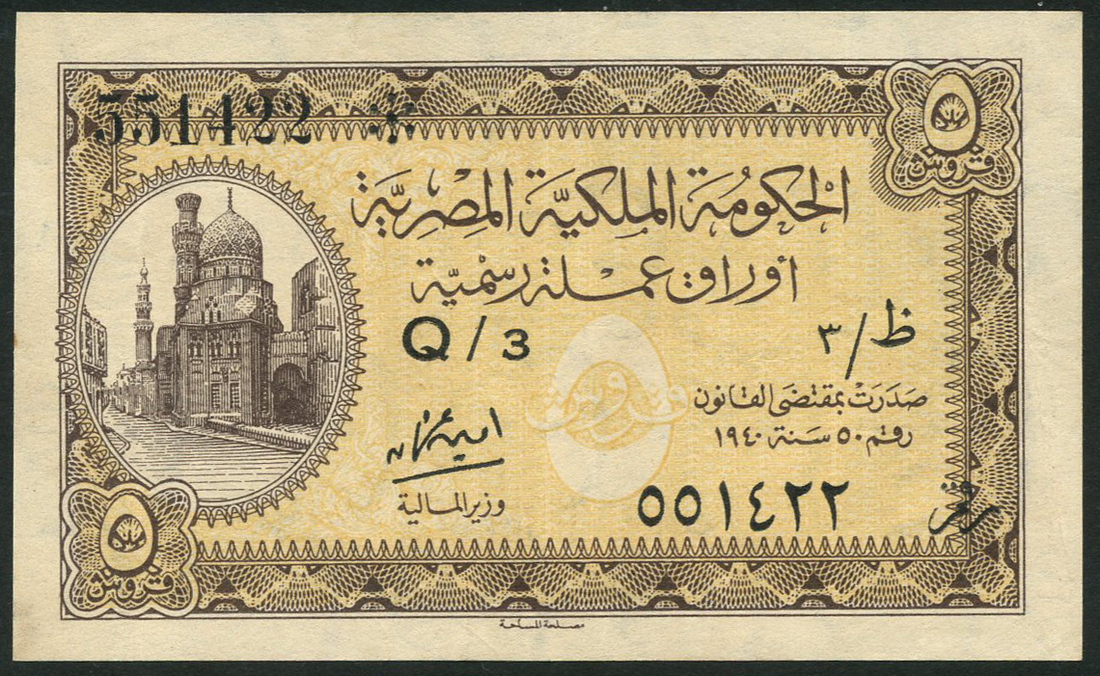 (x) Egyptian Government Currency notes, 5 piastres, ND (1940 Issue), serial number Q/3 001422, brown on yellow, Mosque of Emir Khair at left and 5 piastres proof of reverse, grey, ornate border value at lower left and right