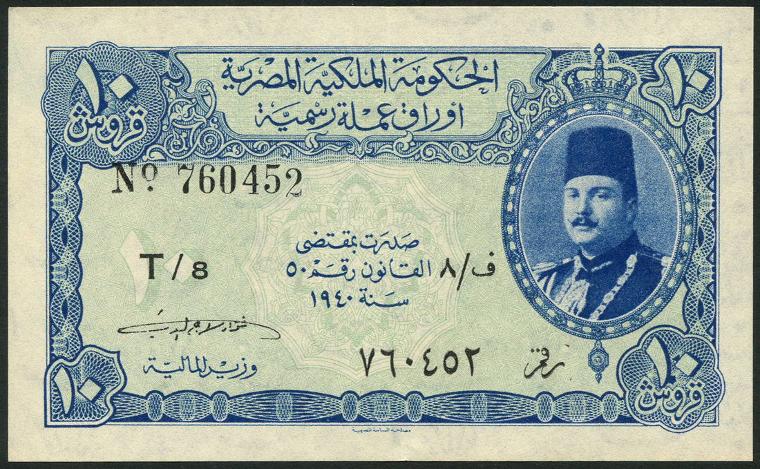 Egyptian Government, 10 piastres, 1940, serial number T/8 760452, blue on pale green underprint, King Farouk at right, value at each corner