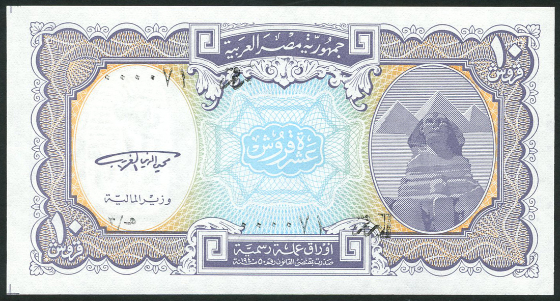 Arab Republic of Egypt Currency notes, 5 piastres ( 41), ND (1998), 10 piastres (104), ND (1998), different prefixes, all serial number 000071, various colours, Queen Nefertiti at right on 5 piastre, and Sphinx at right on 10 piastre