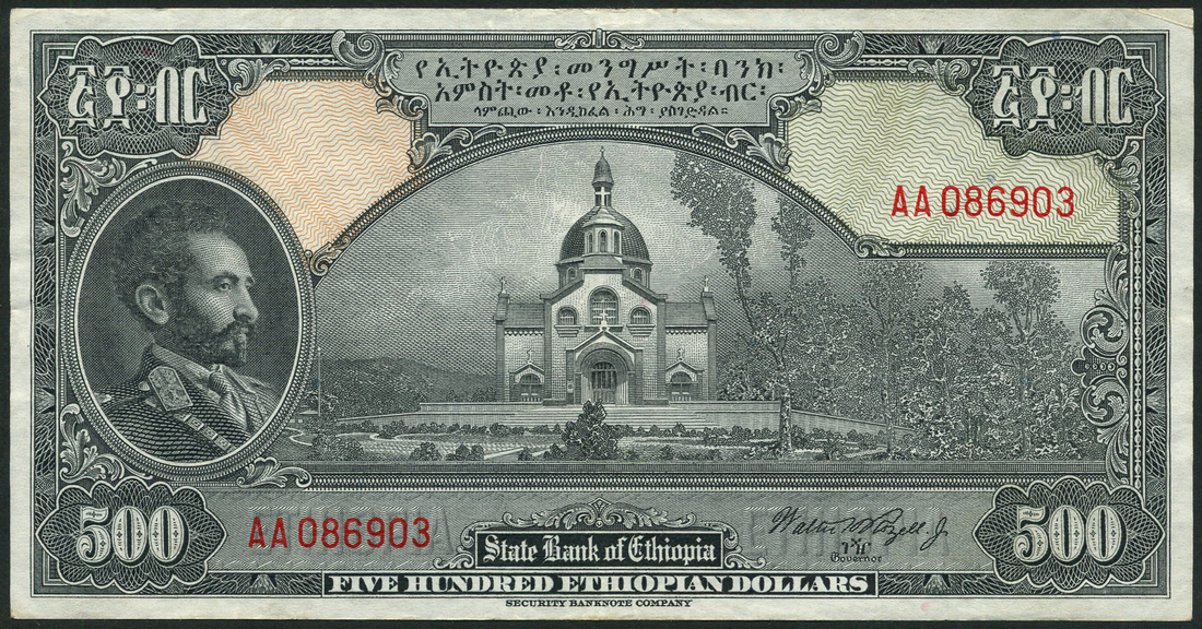 State Bank of Ethiopia, $5, $100 and $500, ND (1945-54), all black on multicolour underprint, Haile Selassie at left, value at each corner, reverse orange, mauve and olive green respectively, crowned lion at centre