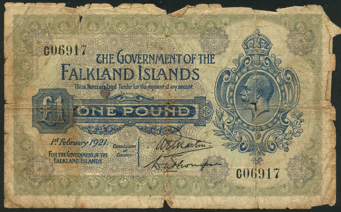 (x) Government of the Falkland Islands, £1, 1 February 1921, serial number C06917, olive green and blue, portrait King George V in highly ornate circular frame at right, bank title top centre, value in dark blue tablet below, reverse, guilloche pattern