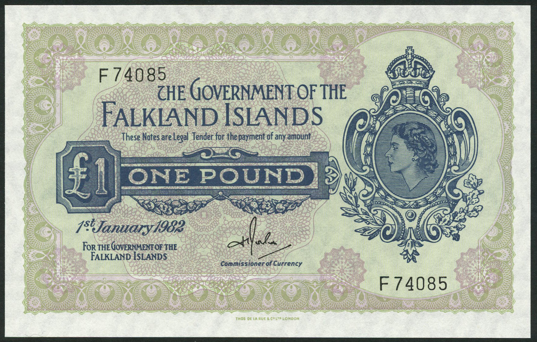(x) Government of the Falkland Islands, 50 pence, 25 September 1969, prefix D, brown and grey, also £1, 1 January 1982, prefix F, green, lilac and blue, both Elizabeth II at right, Gleadell and Rowlands signatures respectively