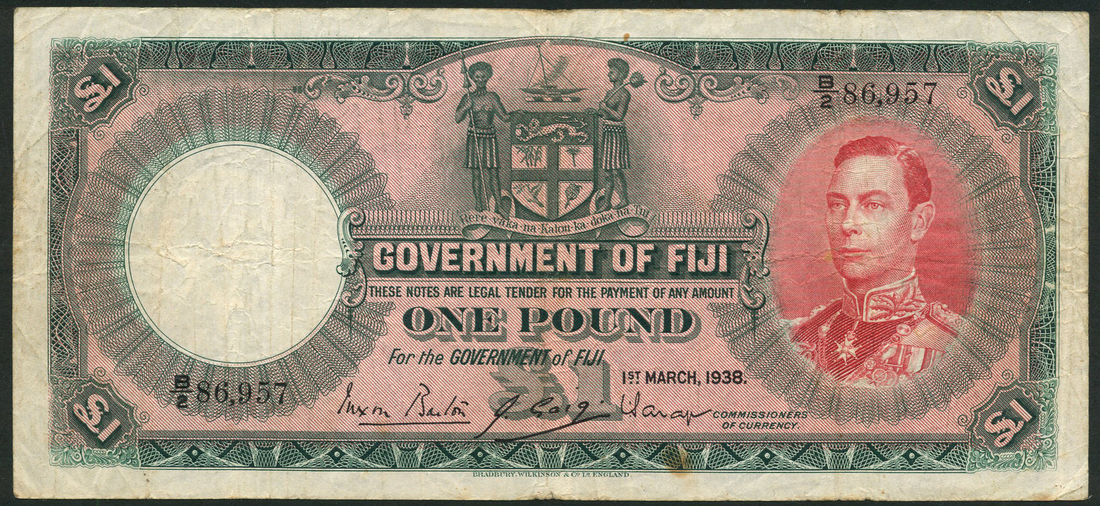 (x) Government of Fiji, 10 shillings, 1 July 1950, serial number B/461,237, brown and dark blue on pale blue, £1, 1 March 1938, serial number B/2 86957, green, pink and red, George VI at right, arms at top centre, also Bahamas Government issue, £1, Law of 1936 (1941), serial number A/4 135901, signatures Heape, Taylor and Moore, signature title Colonial Secretary, Commissioner of Currency at left, black, King George VI at right, ship seal at left, reverse purple, orange and green, coat of arms at left, value in ornate guilloche at right