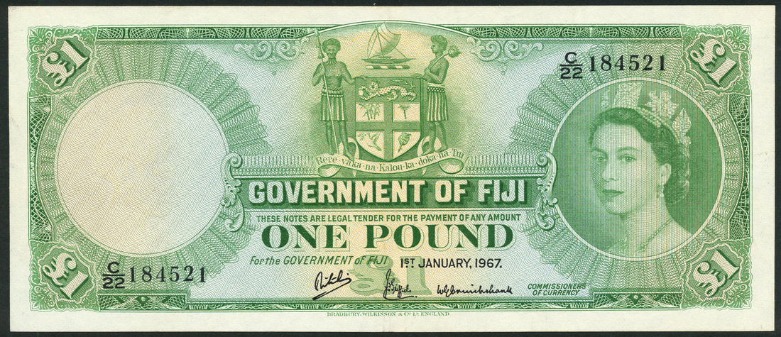 Government of Fiji, £1, 1 January 1967, serial number C/22 184521, green on multicolour underprint, Elizabeth II at right, arms at top centre, value at centre and each corner, also, $5, ND (1969), serial number A/1 006755, orange on multicolour underprint, Elizabeth II at right, arms at centre, value at low centre and top left and right, and $2, ND (1974), serial number A/5 432303, green on pale blue and yellow underprint, portrait Queen Elizabeth II at right, arms top centre, reverse, green, value at each corner and at centre, ornate tablet top and lower margin