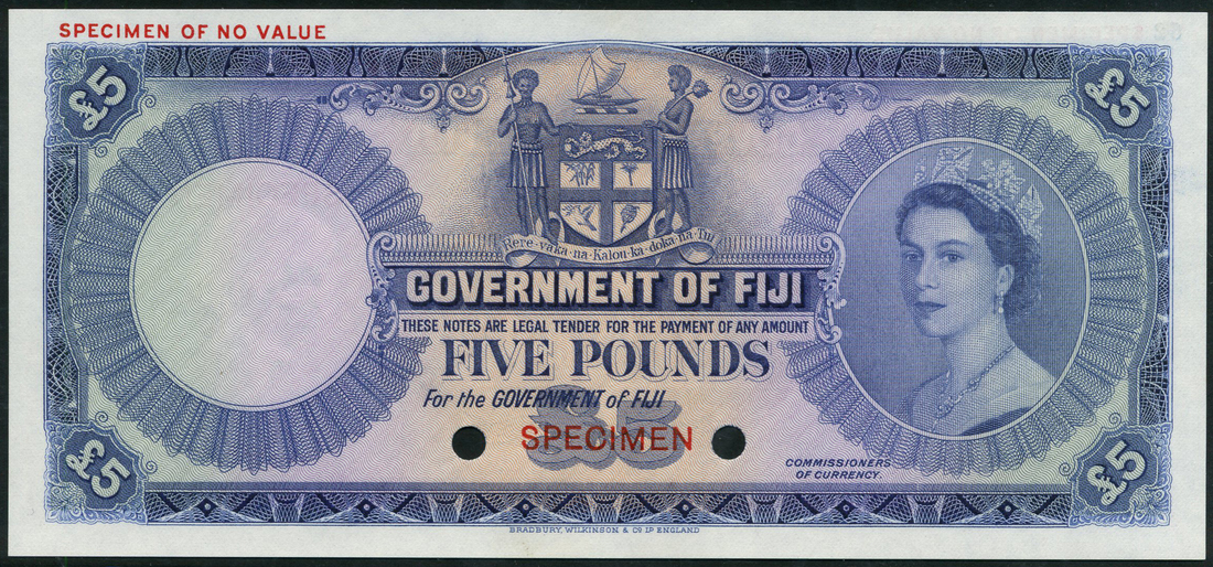 (†) Government of Fiji, specimen colour trial £5, ND (c.1954), no serial numbers, no signatures, blue on lilac and pale green underprint, portrait of Queen Elizabeth II at right, value in each corner, reverse blue, value at centre, ornate guilloches at left and right, overprinted SPECIMEN in red on obverse and reverse, two punch holes