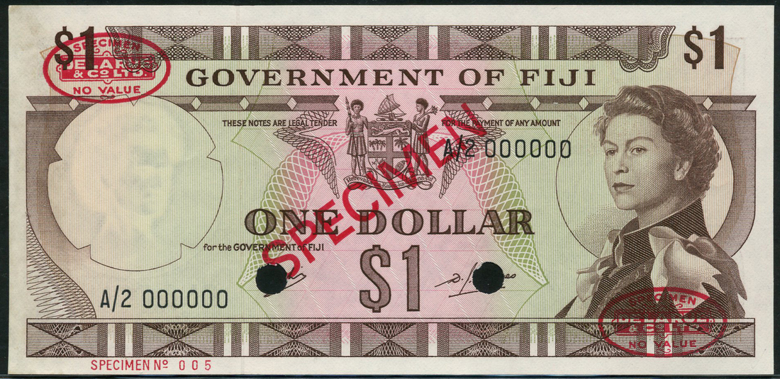 (†) Government of Fiji, specimen 50 cents, ND (1969), serial number A/1 000000, green and specimen $1, ND (1969), serial number A/2 000000, brown, both with red SPECIMEN overprint, hole punched