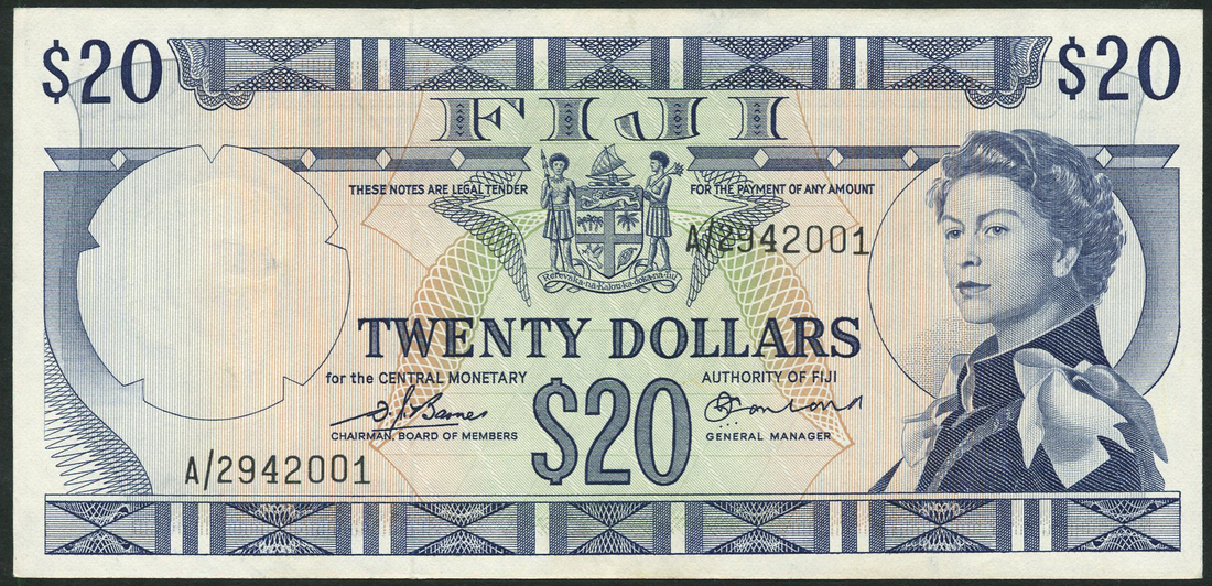 (x) Central Monetary Authority, Fiji, $10, ND (1974), serial number A/2 039600, signatures Barnes and Craik, purple and multicoloured; $20, ND (1974), serial number A/2 942001, signatures Barnes and Earland, blue on multicoloured underprint, both Annigoni portrait of Queen Elizabeth II at right, coat of arms at upper centre, value at lower centre, top right and left, reverse ornate geometric patterns, also, Bank of Jamaica, £1 (2), Law of 1960 (1964), serial number DM214429, signature R. T. P. Hall as Acting Governor, and serial number FV930041, signature G. A. Brown, both green on multicoloured underprint, Queen Elizabeth II at left, coat of arms at lower centre, reverse, tractor harvesting grain
