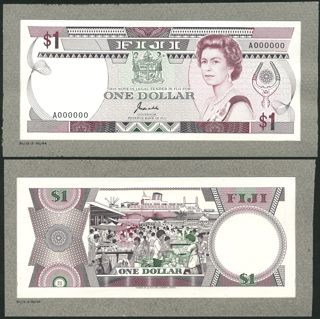 (†) Reserve Bank of Fiji, a printers archival composite essay on card for a proposed issue of $1, ND (1990), serial number A 000000, mauve and pale green, Elizabeth II at right, arms top centre, Jone Kubuabola signature low centre, 'domodomo' at right, reverse mauve and green, the marketplace in Suva at centre, ship in background