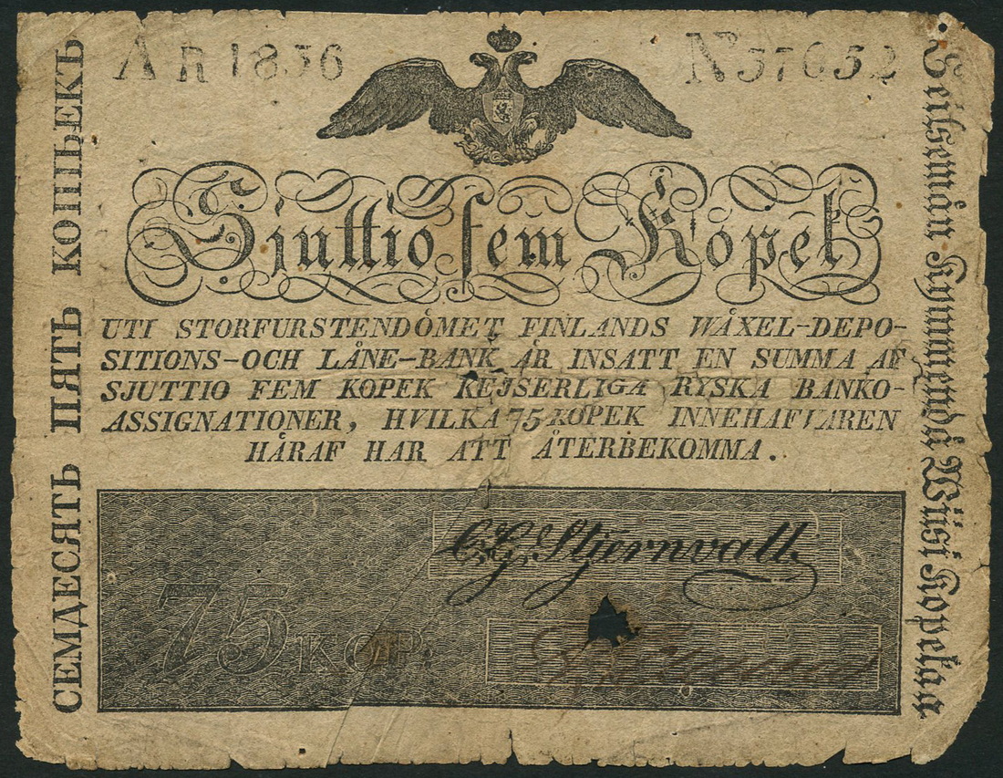 (x) Storfurstendomet Finland, Assignates Issue, 75 Kopeks, 1836, serial number 37052, black print, double headed eagle top centre, manuscript signature in black panel