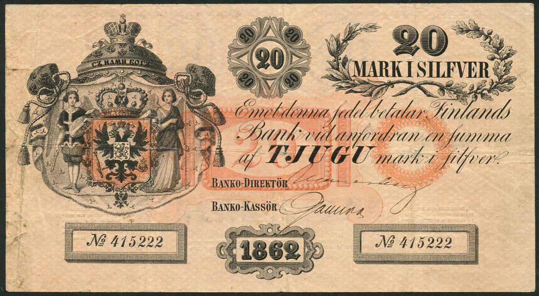 (x) Finlands Bank, 20 markkaa, 1862, serial number 415222, black on red underprint, crowned arms at left, flanked by man and women