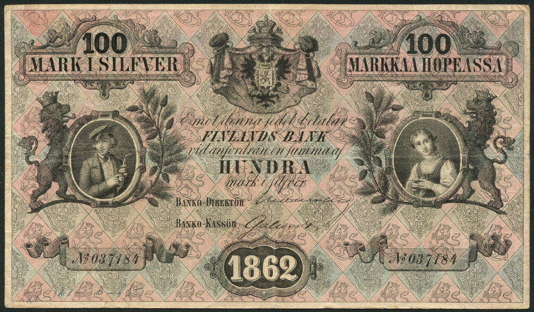 (x) Finlands Bank, 100 markkaa, 1862, serial number 037184, black print on pale pink and blue, coat of arms at top centre
